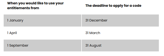Please see the table below which shows the deadlines for applying for codes. If your code is not valid on the date below, we cannot apply for funding in that term.